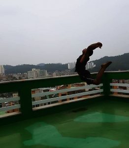 September 2017- On a wet rooftop in Seoul. Victor Peturo launches himself skyward, arms and legs thrown back forming a perfect crescent. A symbolic image of his solo-show ‘CHANGE “change changed me” ’. Little did he know that three months later, his impressive jump would be immortalized on the AfriKera Arts Trust Banner.
